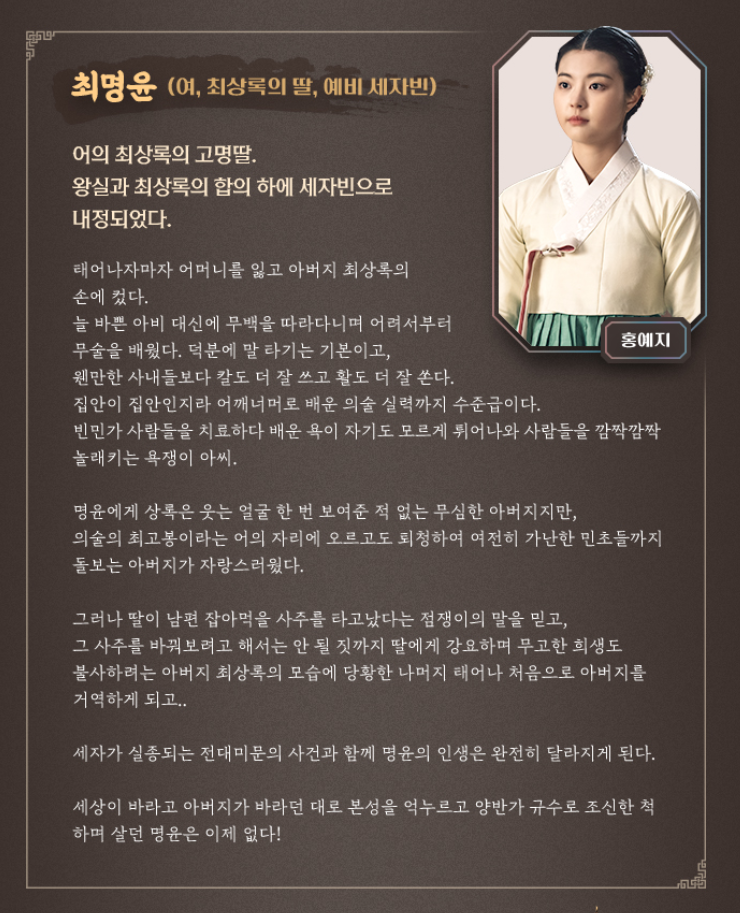 홍예지는 ‘세자가 사라졌다’에서 어의 최상록의 고명딸인 최명윤 역으로 분한다. 깜찍발랄한 모습뿐만 아니라 승마와 의술에 뛰어난 능력을 보이며 다재다능한 명윤의 면모를 보여줄 예정이다.